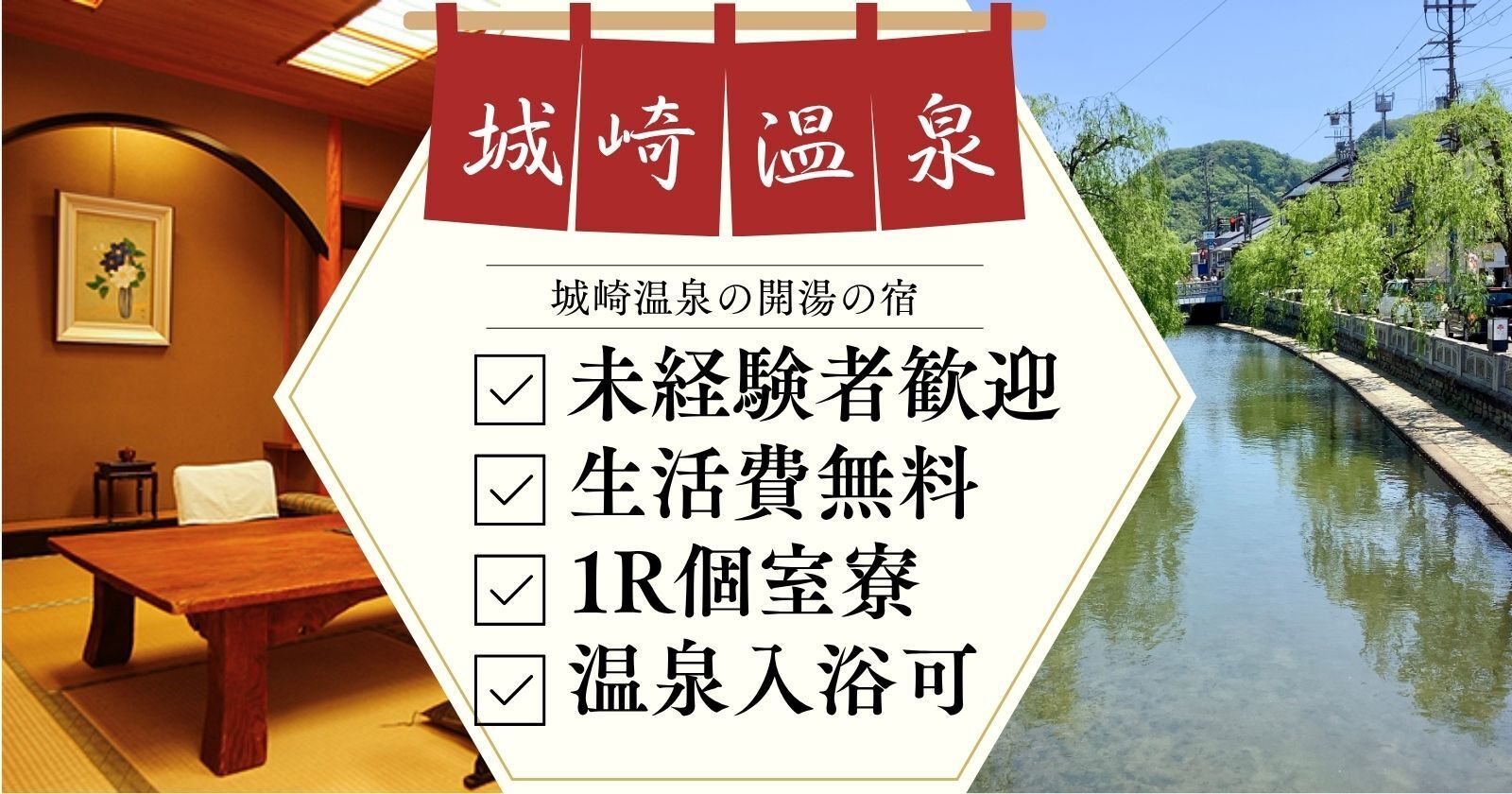 【城崎温泉×1R個室寮×Wi-Fi完備×温泉入浴可】未経験大歓迎!人気施設!お仕事もプライベートも充実させたい方は是非!!