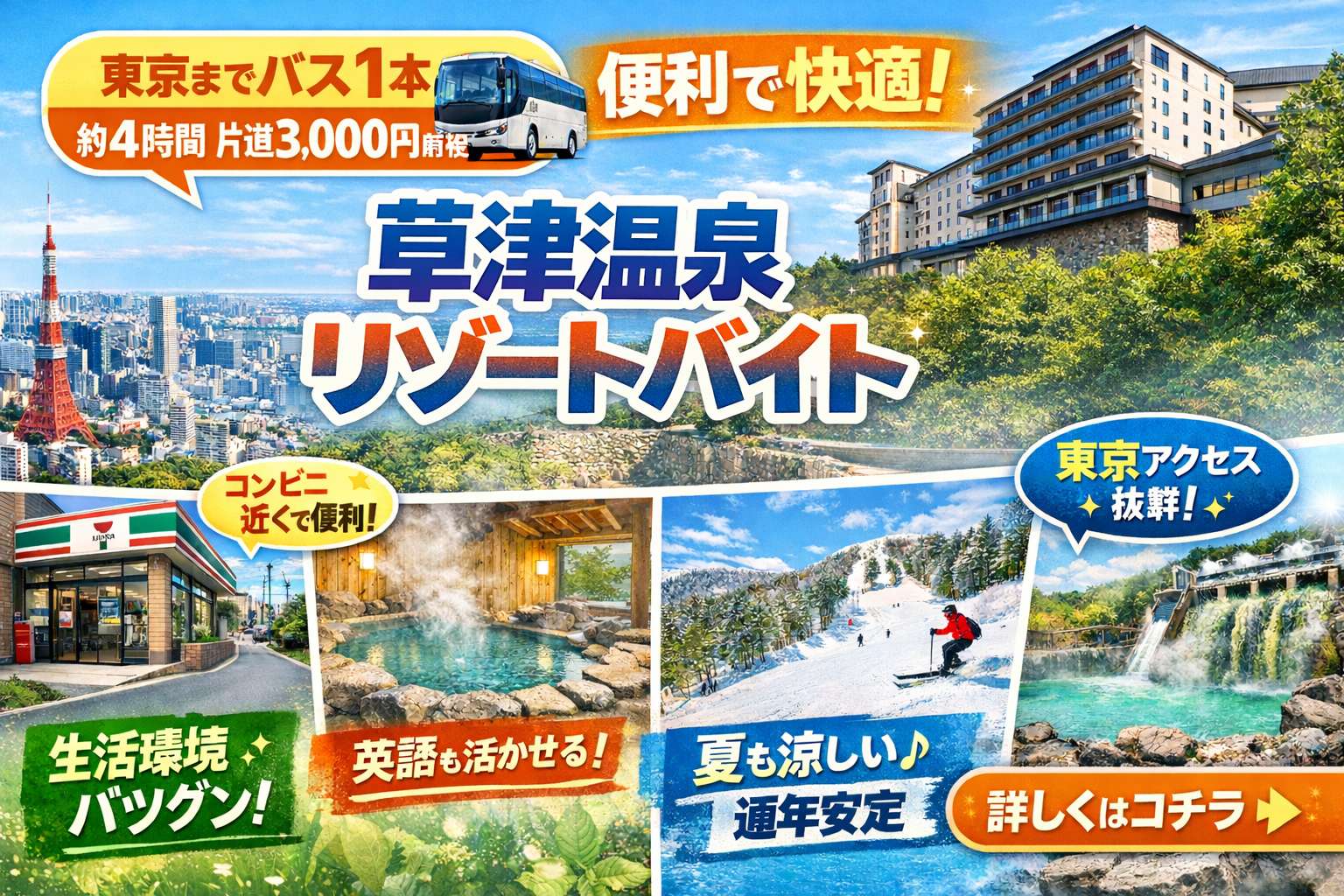 【新宿直通×食事無料×通年安定で働ける草津温泉】スーパー/コンビニ/ドラックストアが徒歩圏内で生活しやすい環境