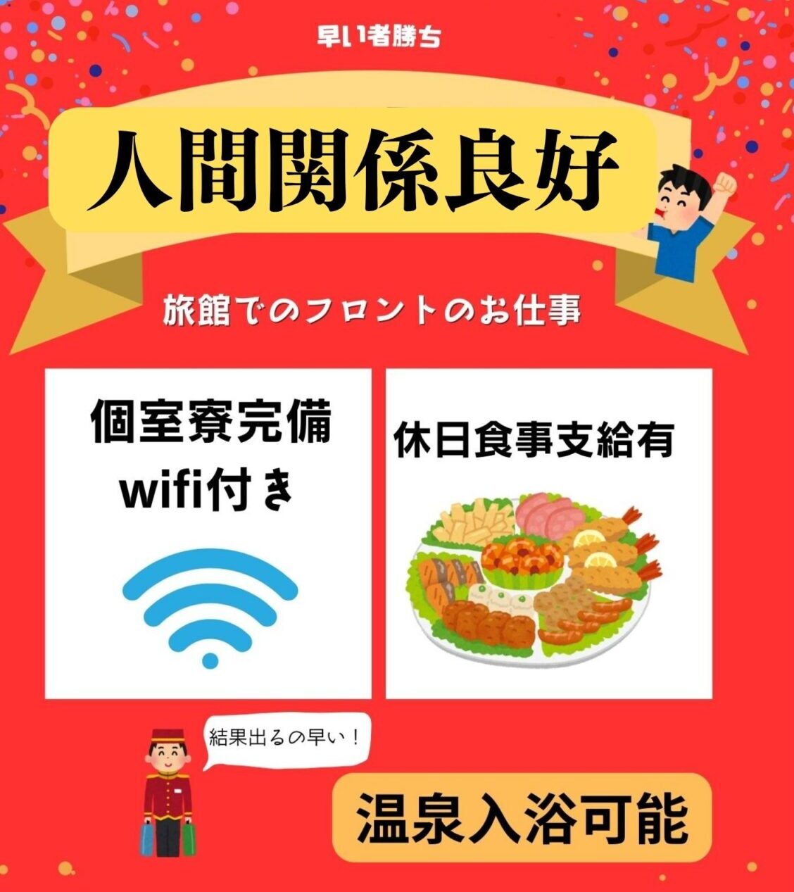 即日可能【温泉入り放題×食事付き×館内寮】人気条件そろってます!Wi-Fiありで生活も快適!
