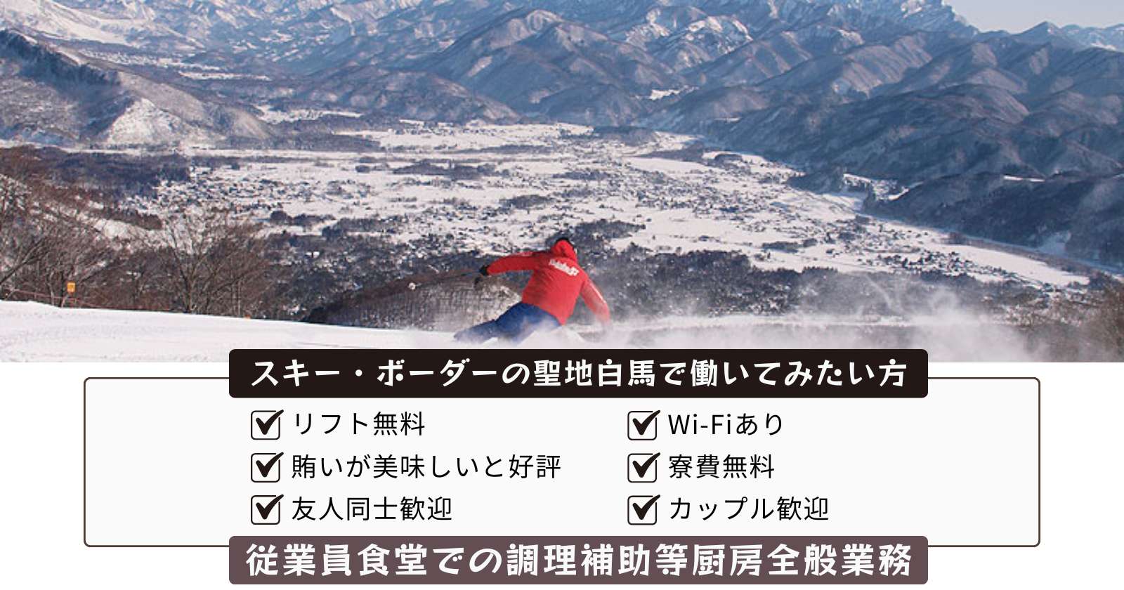- 時給1250円、シーズンリフト券無料、レンタル割引(1日1000円・月レンタルもあり)、ナイター利用可、 相部屋寮(水光熱費無料)、食事3食支給(休日含め)、給与前払い制度、往復交通費規定内支給、車持ち込みOK、友人同士・カップルOK