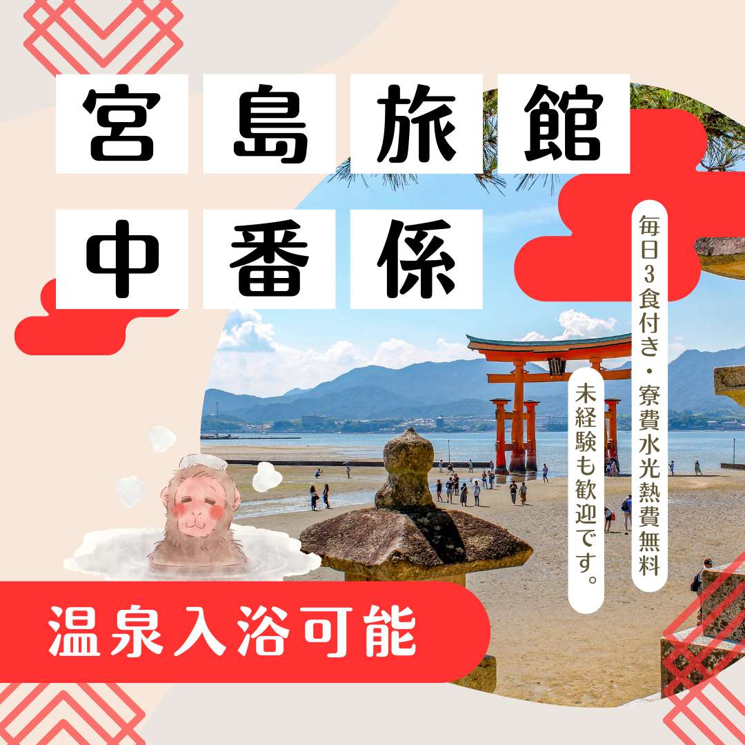 厳島神社近くの求人!未経験歓迎で、施設の浴場利用可能×毎日3食支給×稼げる×派遣実績も豊富な施設でリゾートバイト!