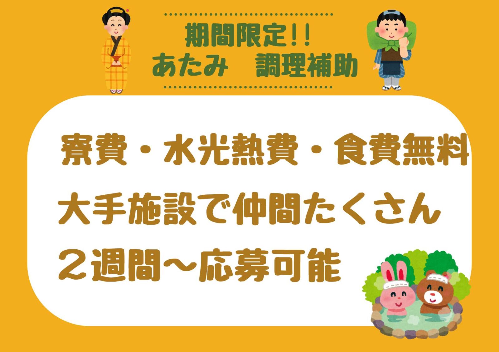 私自身もリゾートバイト経験者の為、皆様に安心してお仕事していただけるよう就業前も就業中も全力でサポートいたします。