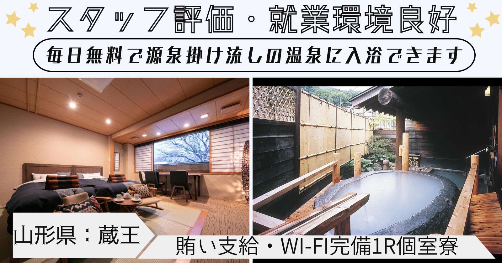 - 寮費無料 食費無料 水光熱費無料(一部) 温泉入浴無料 個室寮完備 前払い制度