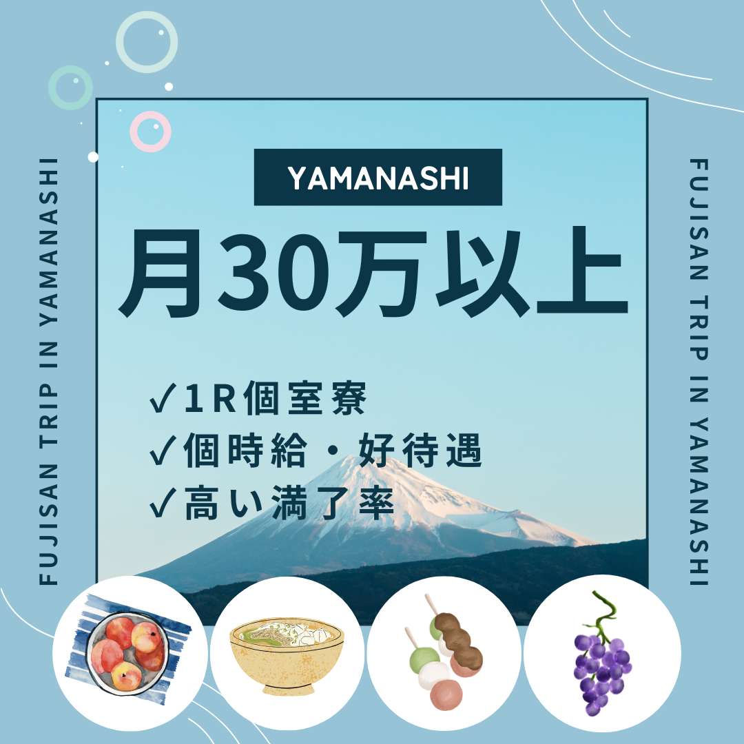 - 1R個室寮完備(バストイレ別)・寮費無料・水光熱費無料・食事無料・前借り制度対応可能・雇用保険完備・社会保険完備・労災保険完備・自転車貸出有り
