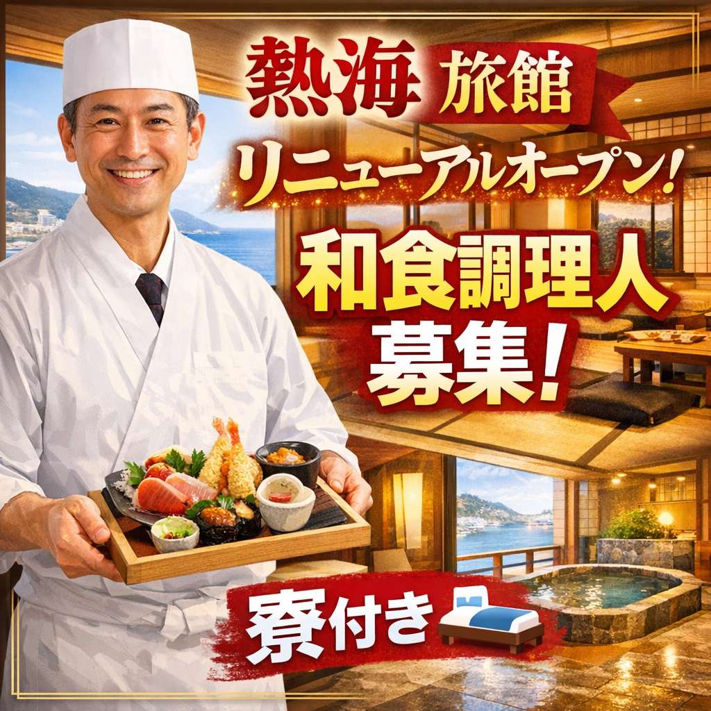 【JR来宮駅から徒歩圏内!】熱海の宿泊施設で調理のお仕事/リニューアルオープンの施設です!【寮・社宅完備/食事支給有】