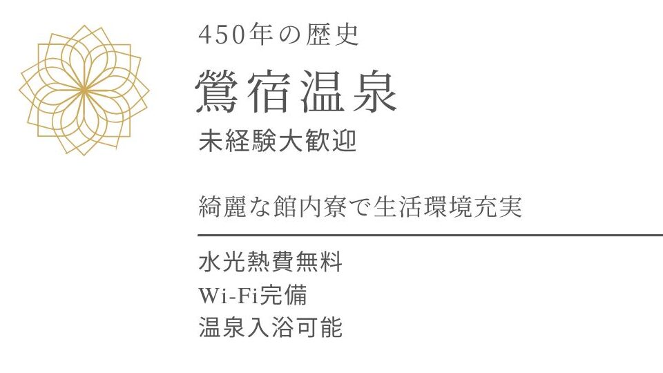 - ・個室寮完備 ・水光熱費無料 ・給与前払い制度あり ・車持込み可 ・交通費規定内支給 ・制服貸与有り ・温泉入浴可(5:00~24:00)
