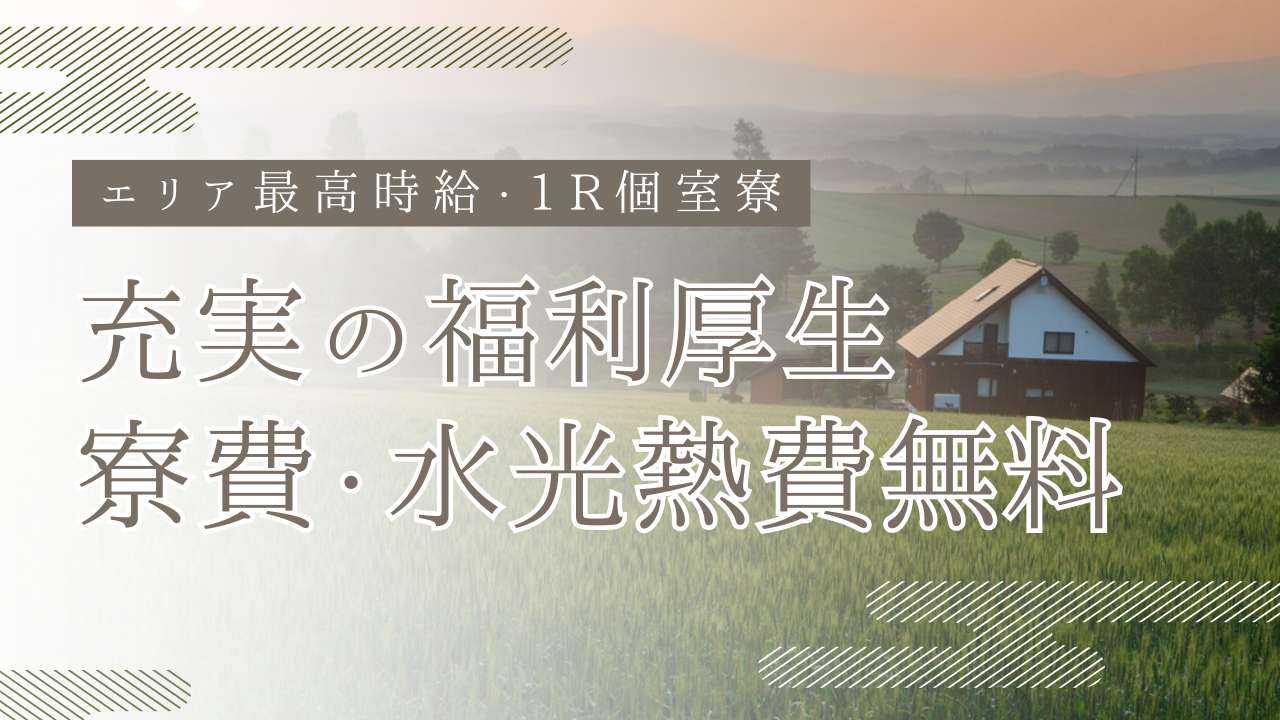 - 寮費(個室寮)無料、食事全日無料、水光熱費無料、往復交通費規定支給(規定あり)、給与前払い制度、車持ち込み可、温泉入浴可能、送迎あり、フィットネスの利用可