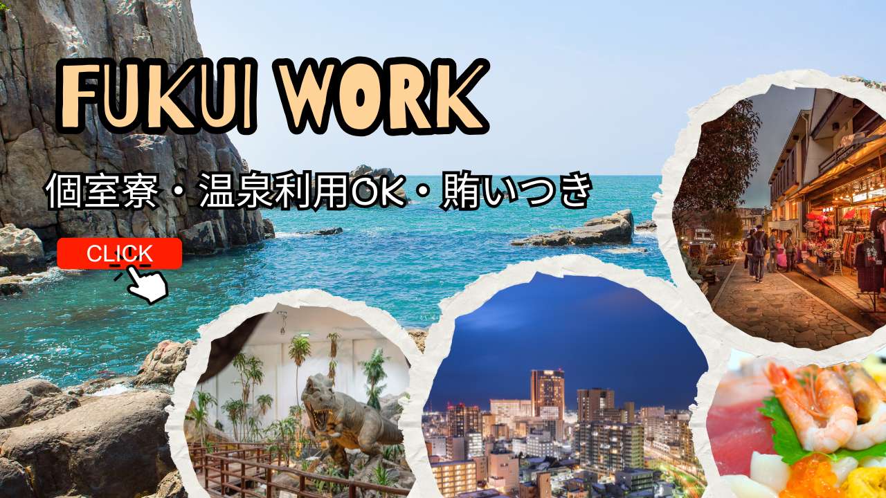 - 1R個室寮費無料、水光熱費無料、食事支給、温泉入浴可、往復交通費支給(弊社規定)、車持ち込み可、給与前払い制度あり、時間外割増25%、