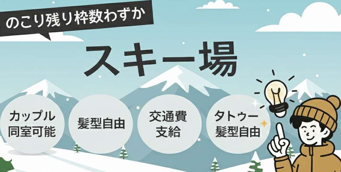 急募!!短期でOK!【カップル同室OK!×短期OK×髪色・髪型自由×タトゥー可能×リフト券無料】