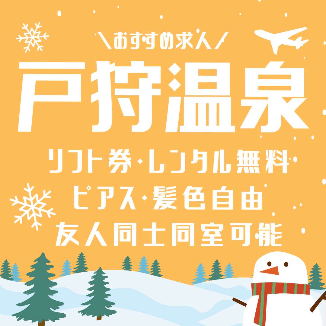 - 寮完備 /各種保険完備 / 食事支給(毎日) /リフト券無料/ 寮費無料/水光熱費無料 /交通費支給(上限2万円)/車持ち込み可/ 給与前払い制度導入済/各種割増手当有(残業・深夜)/ お友達紹介制度有(最大5千円贈呈) etc...