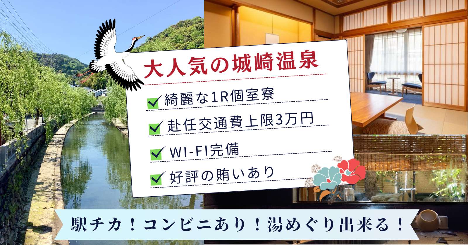 【1R個室寮×Wi-Fi完備×周辺環境抜群×未経験でも可】人間関係良好!!大人気の城崎温泉でお仕事しませんか?