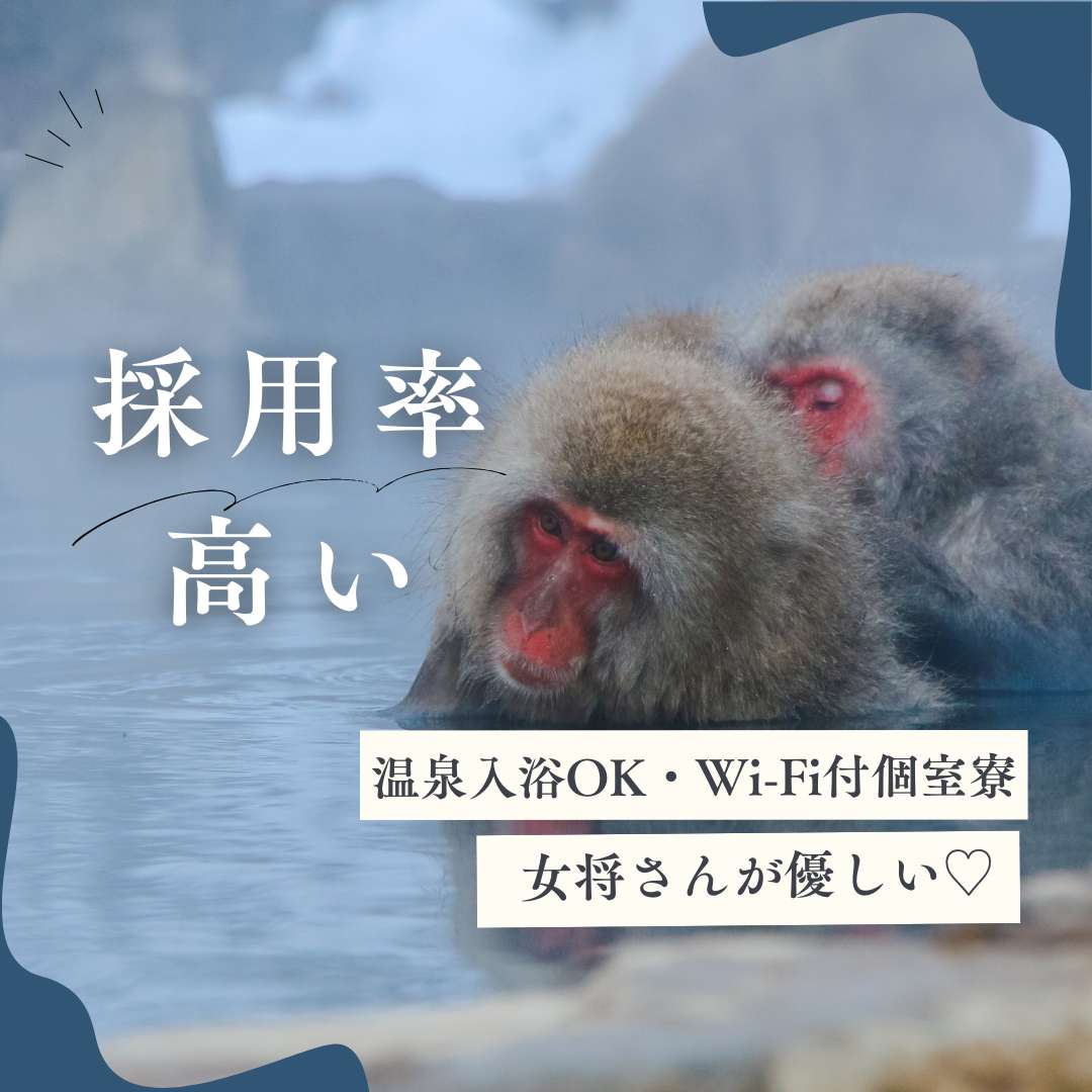 - 個室寮、寮費、水光熱費、食事無料 往復交通費支給(弊社規定)、給与前払い制度有、給与定期昇給有、温泉入浴無料、九つの湯巡りチケット無料貸与、制服無料貸与、寮備品完備、WIFI完備、