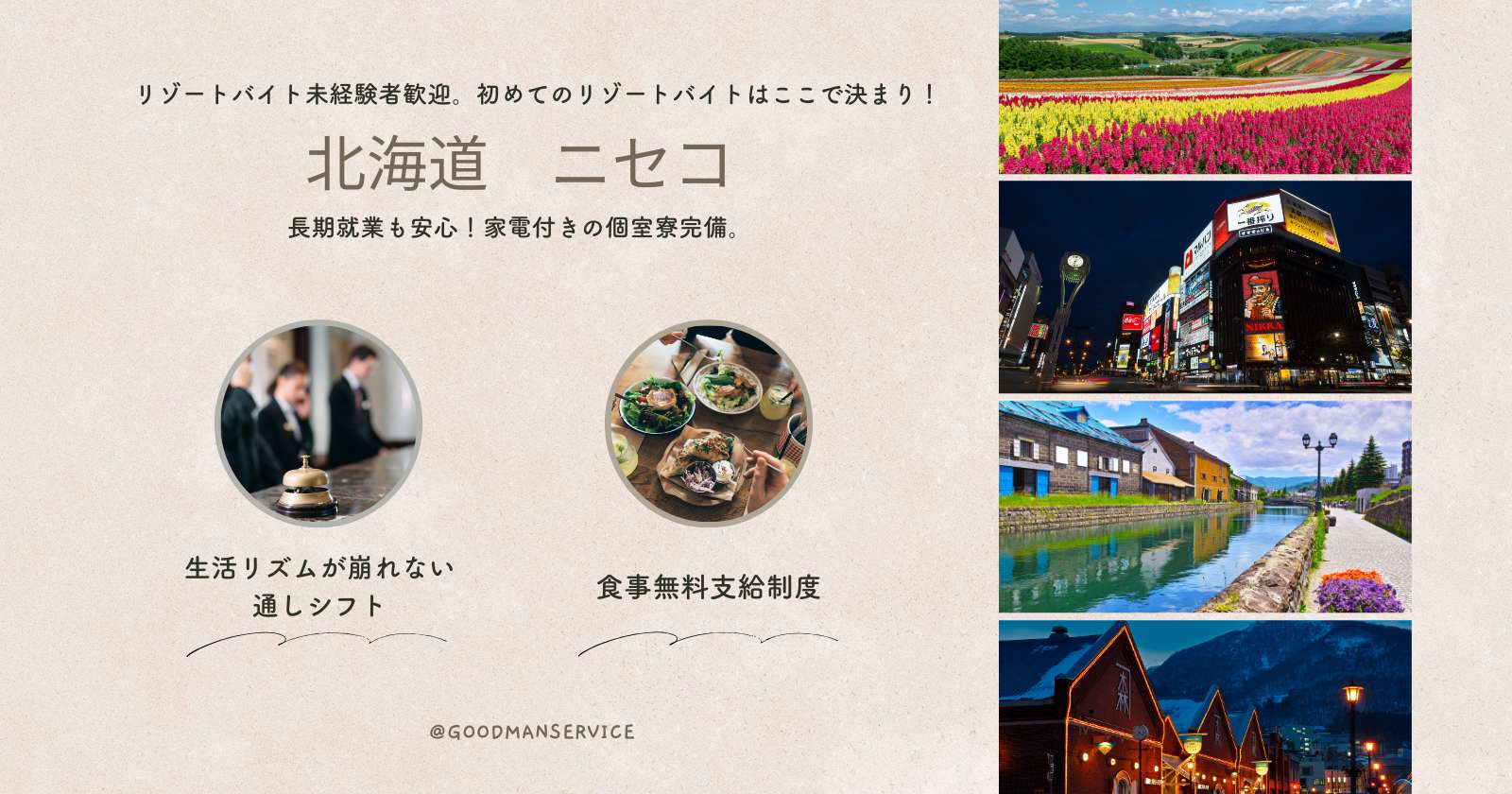 - ・寮費無料・食費2食無料支給有・水光熱費無料・赴任交通費支給有(上限20,000円) 期間満了で交通費実費負担)・車持ち込み可・給与前払い制度有・スキー場リフト券付き(冬季のみ)