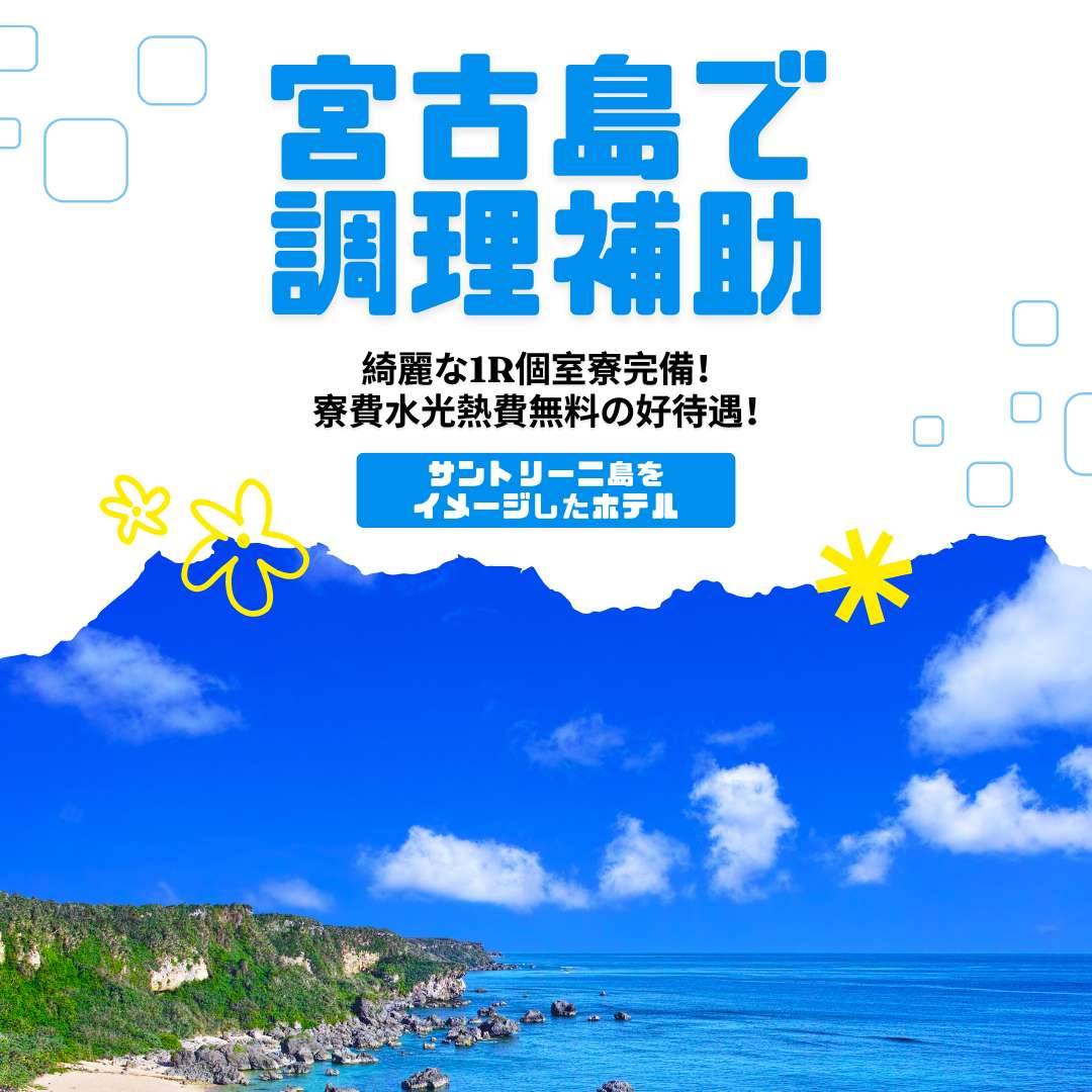 最短2か月でもOK!サントリーニ島をイメージしたホテルでの勤務!調理補助経験を活かせる!宮古島内で最も綺麗な1R個室寮も完備していますよ!