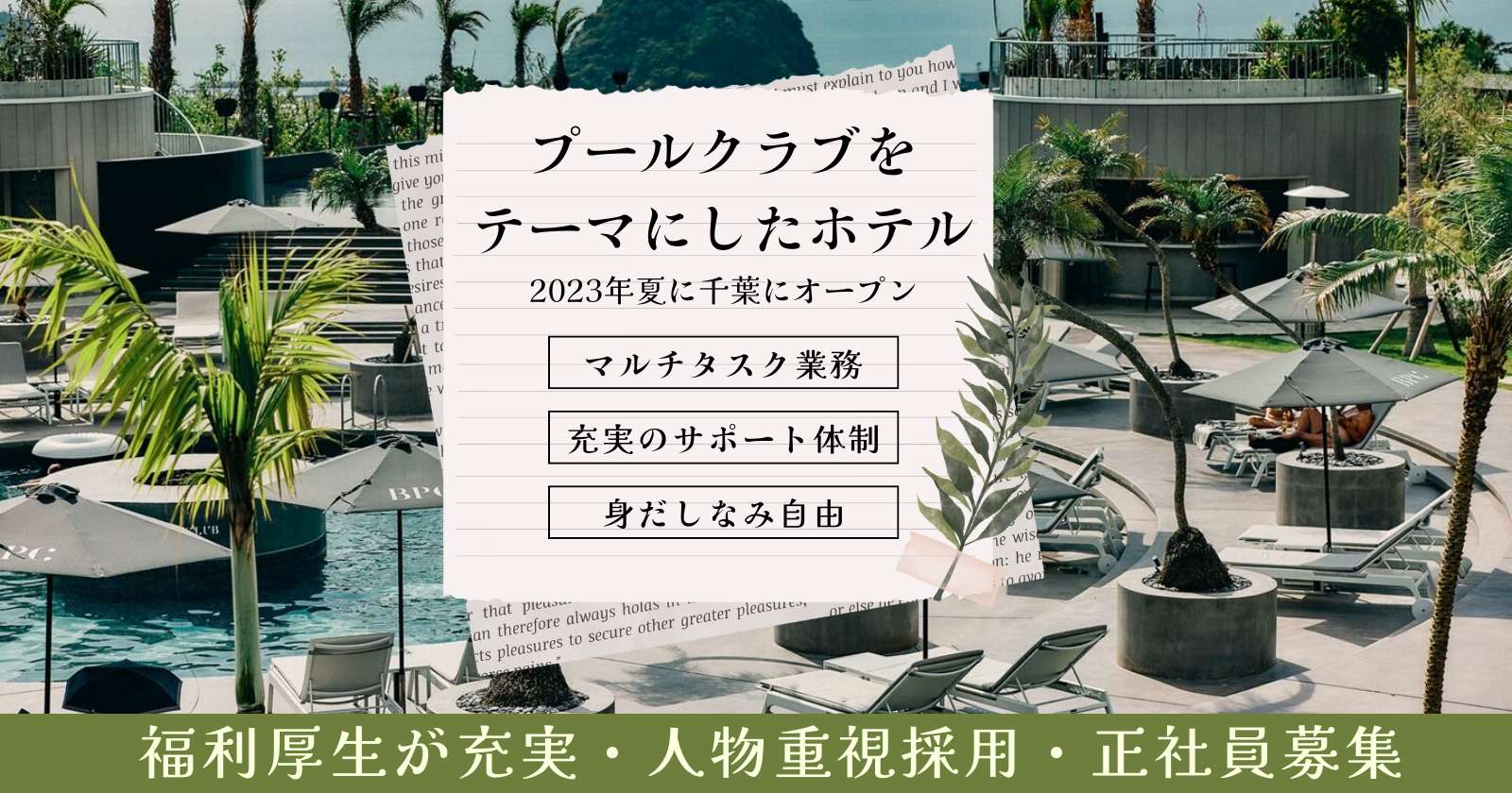 【身だしなみ自由×賄無料×車通勤可】自然の恵みとプールサイドの絶景が広がるリゾートで、ゲストに温かい笑顔と安心感を届ける最前線の仲間を募集!