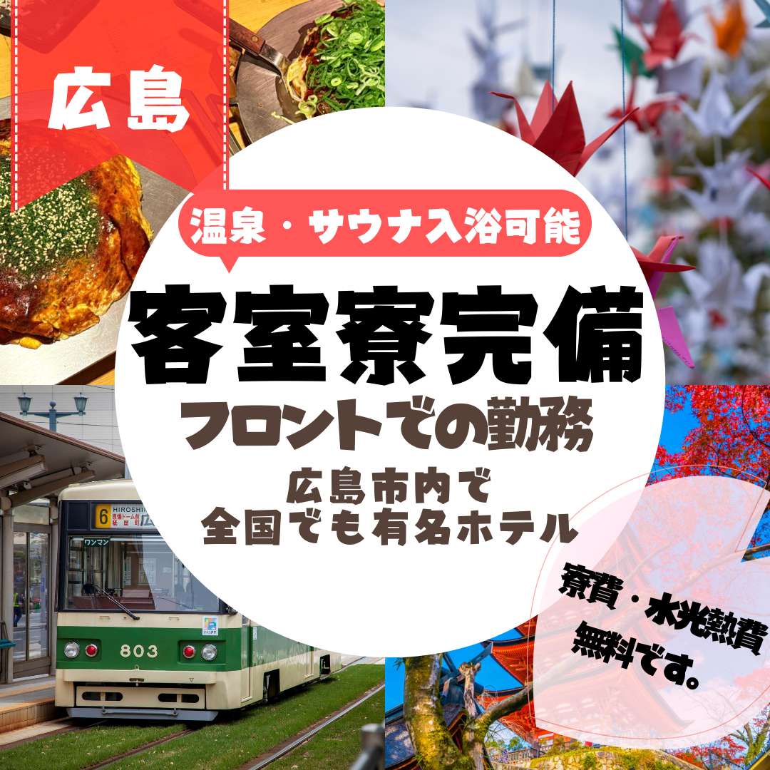 新掲載!広島市内で客室寮に住み込み!大手有名ホテルでのフロント勤務!毎日温泉入浴可能で、サウナにも入り放題です!
