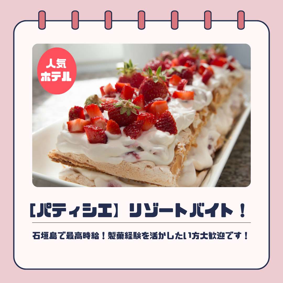 製菓部門・パティシエの経験活かせる!石垣島最大の世界的に有名なリゾートホテルでの就業!施設全体で90名以就業しています!