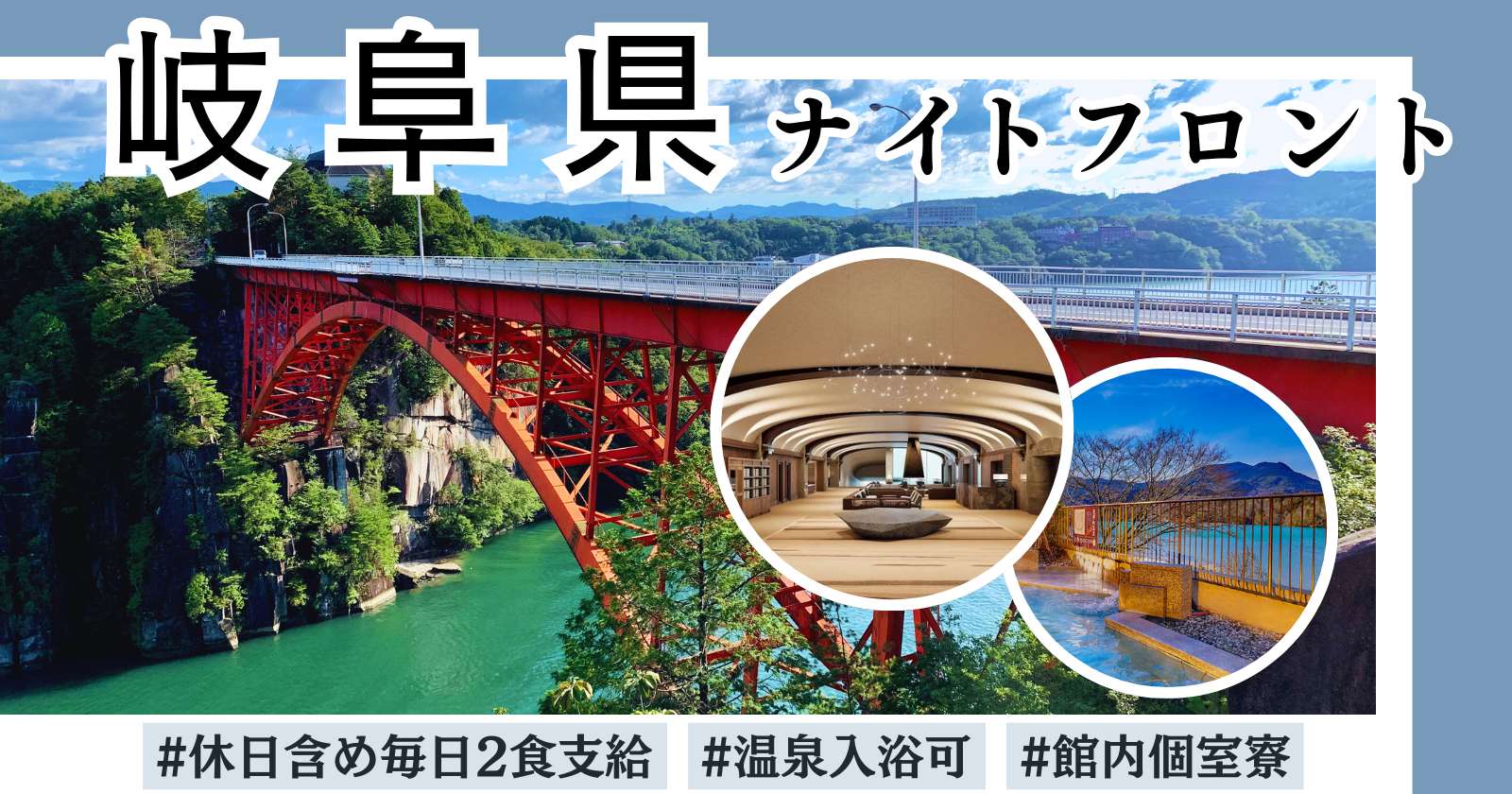 温泉入浴無料・個室寮完備・食事2食毎日無料・人間関係良好・観光地チカ好立地