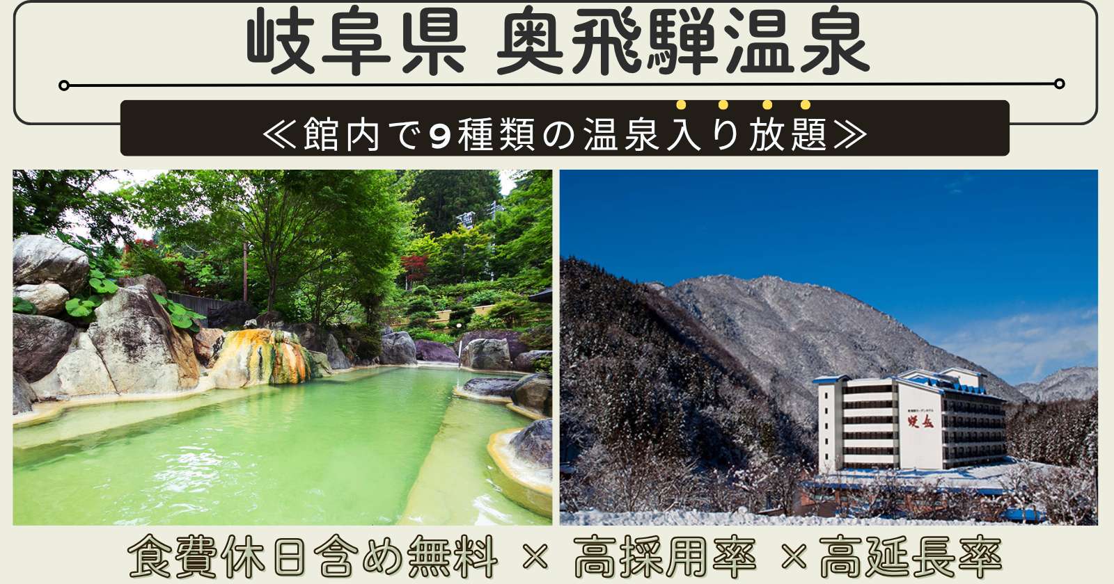 【食事毎日3食無料×個室寮完備×館内で9種類の温泉入り放題】