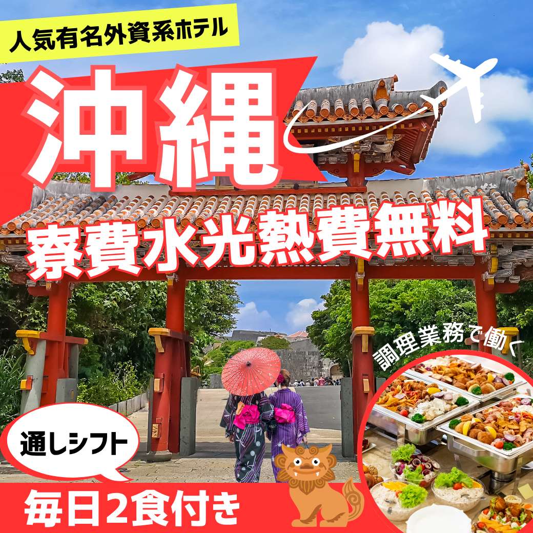 築浅の綺麗な寮確約 × ジム完備!お財布に優しい食事2食無料提供!大人気[沖縄本島]で2ヶ月から選考可能!通し勤務のお仕事です。