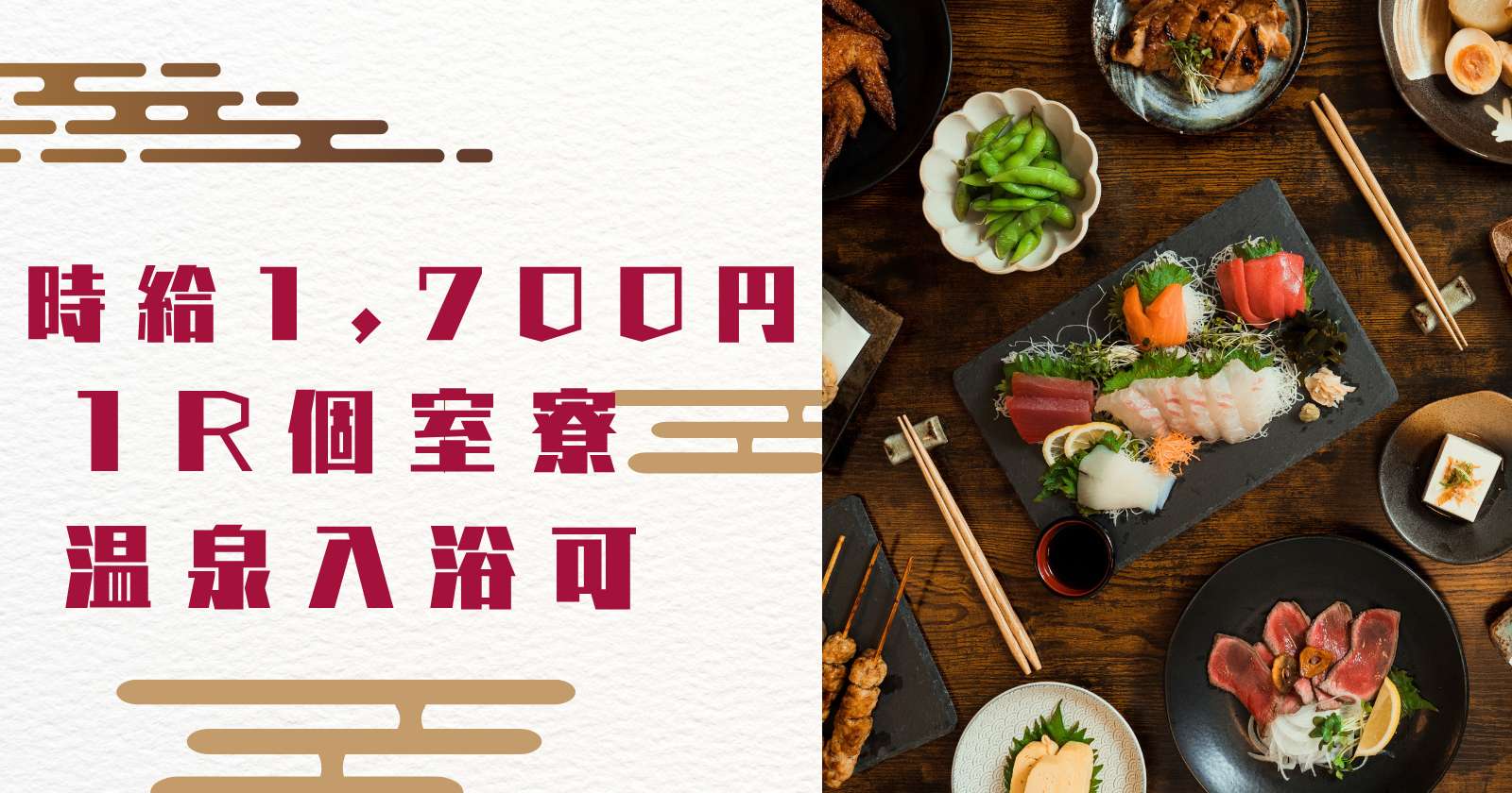 温泉入浴無料・毎日食事無料・個室寮完備・しっかり稼げる環境◎
