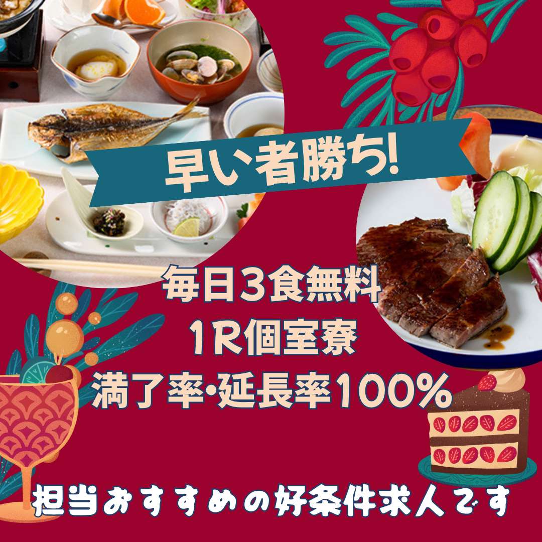- 個室寮、寮費・水光熱費無料、食事手当あり、往復交通費規定内支給、給与前借制度あり、施設利用可