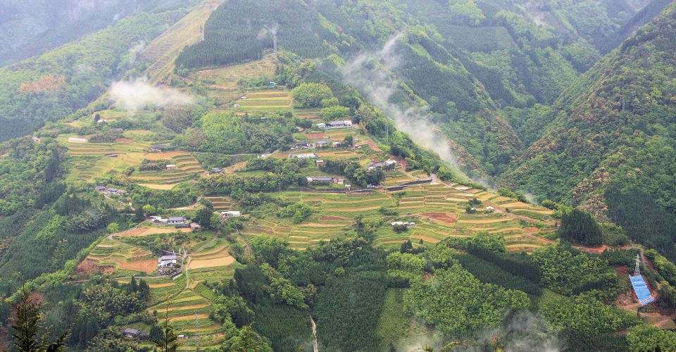 「大いちょう展望台」から対岸の集落を眺めると、急斜面に石垣を組んで作られた棚田が見事に折り重なっています。秋の早朝には深い霧が発生し、霧が晴れ始めた瞬間に姿を現す棚田は「仙人が住む場所」と形容されるほどの神々しさです。
