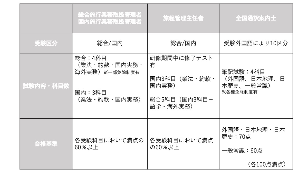 国内旅行業務取扱管理者の試験科目は、業法・約款・国内実務の3科目で、総合になるとこの3科目に海外実務をプラスした4科目。合格するためには年1回の試験で、各科目60%以上が基準と言われています。