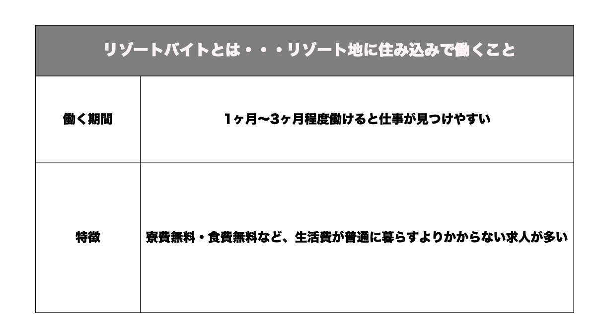 リゾートバイトについて詳しく知りたい方は。別ページ「リゾートバイトとは?」をご覧ください。