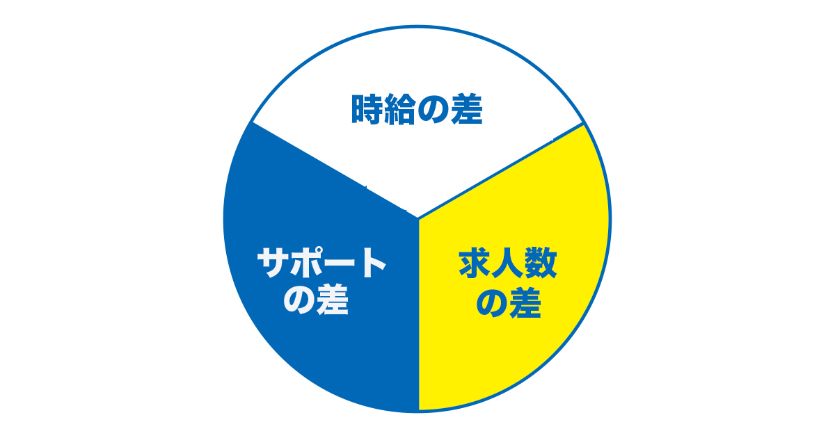 例えば、時給50円の差で1日8時間・月20日働いた場合、8000円の差が発生します。さらに、働けば働くほど差がついていくので長期で働きたい方には、最終的な収入に大きな違いが出てくるでしょう。