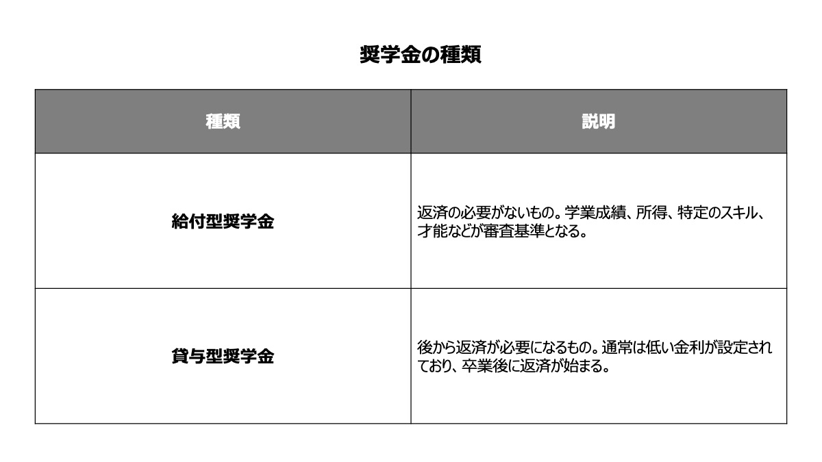 給付型奨学金とは、基本的に返済の必要がありませんが、学業成績、所得、特定のスキルや才能が審査の基準とされることが一般的です。