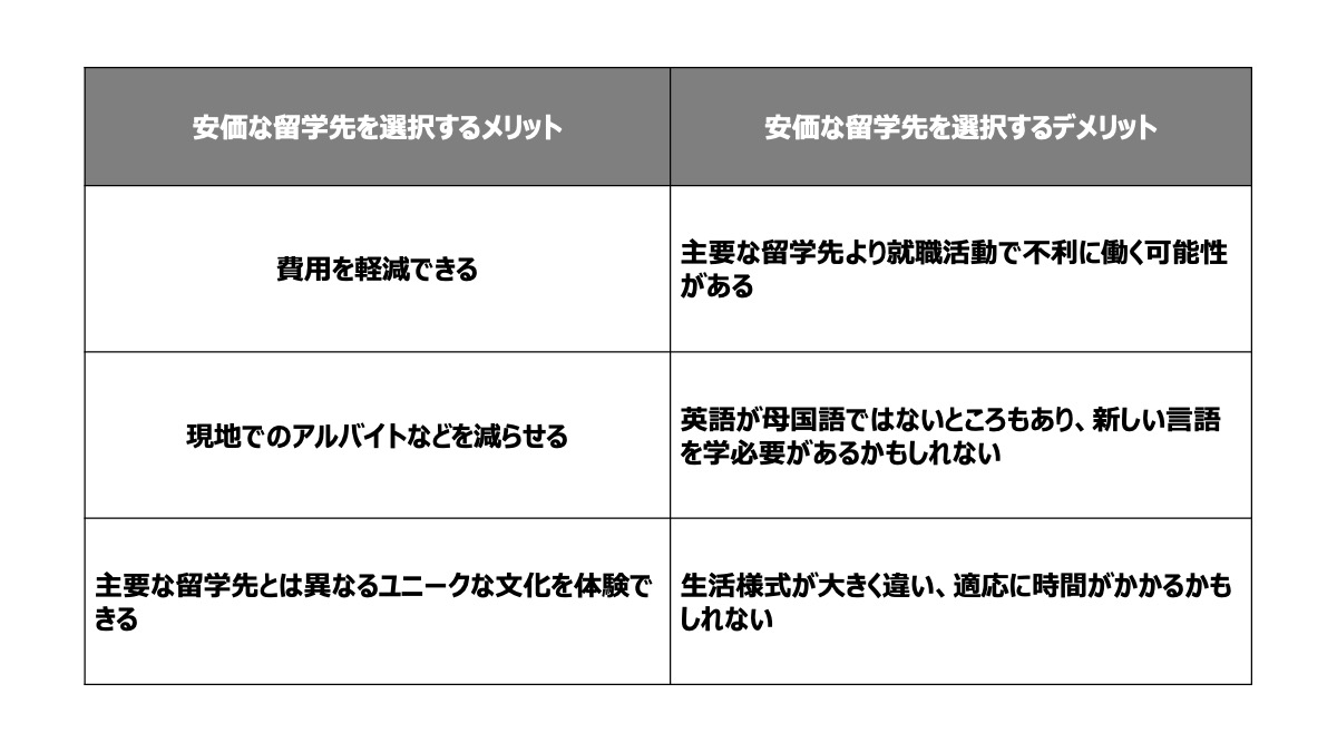 主要な留学先に比べてあまり知られていないことが多く、後々の就職活動で不利に働く可能性もあります。ただし、あくまでも主要な留学先に比べて不利に働く可能性があるだけで、安価な留学先に行くこと自体がマイナスになるわけではありません。