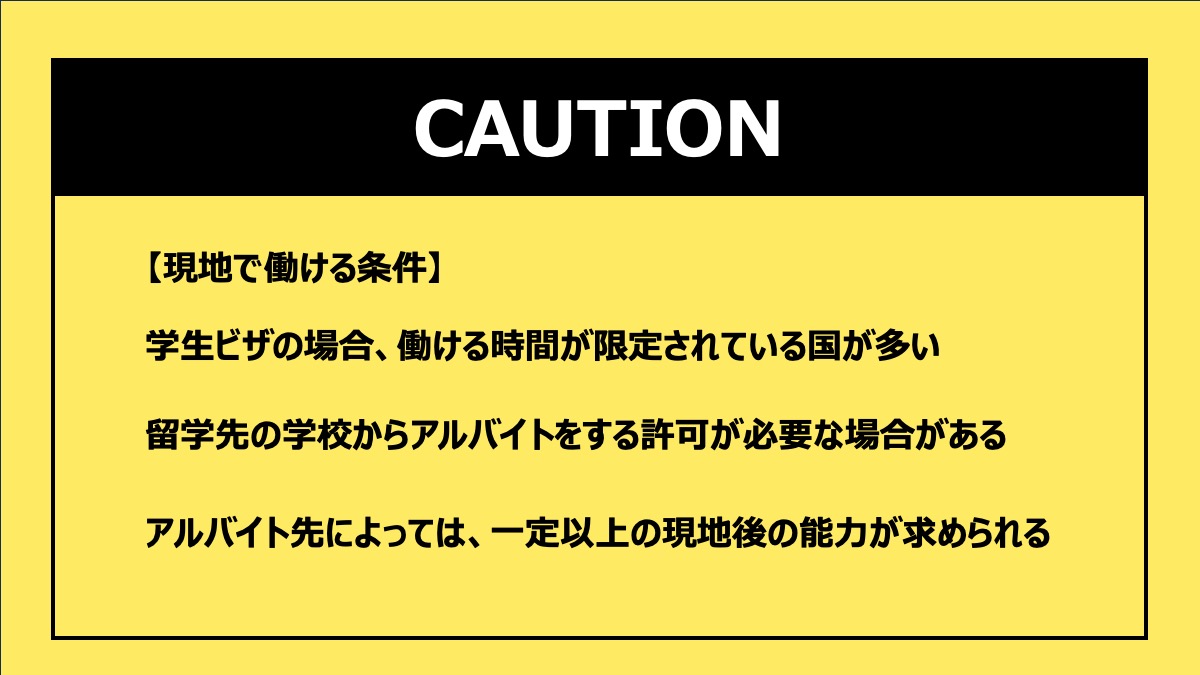 ただし、現地で自由に働けるわけではないので、働ける条件の確認をしておきましょう。まず、多くの国では学生ビザを持っている場合、限定された時間だけ働くことが許される傾向にあります。