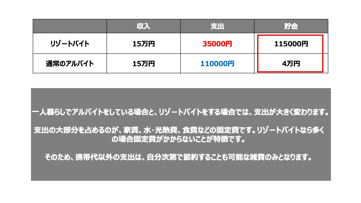 リゾートバイトとは、リゾート地などに一定期間住み込みで働くことを指します。多くの求人が、寮費、食費、水道・光熱費無料になっており、働いている期間は通常生活しているだけでかかってくる固定費が極端に少ないことが特徴です。