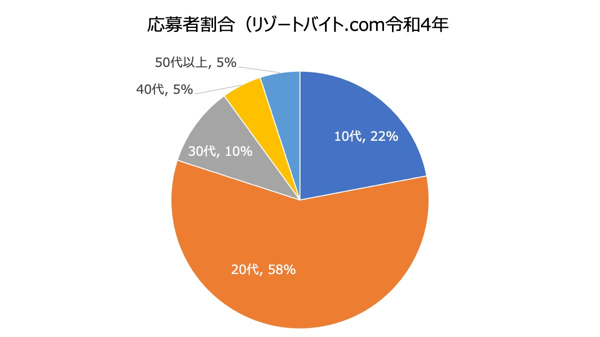 「リゾートバイト.com」の令和4年度の応募者割合を見てみると、10代約22%、20代約58%、30代約10%、40代約5%、50代以上約5%と10代20代で約80%を占めています。