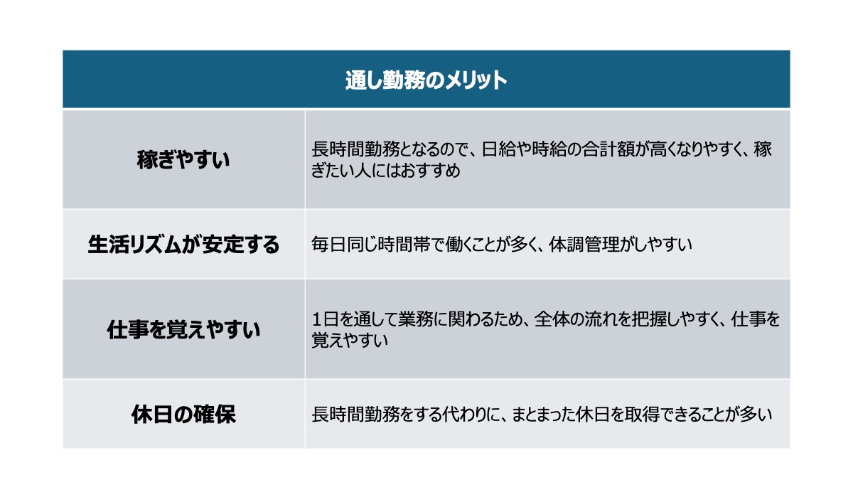 通し勤務は、出勤日の自由度は少ない分、丸一日のお休みをもらえることが多く、リフレッシュするには最適です。