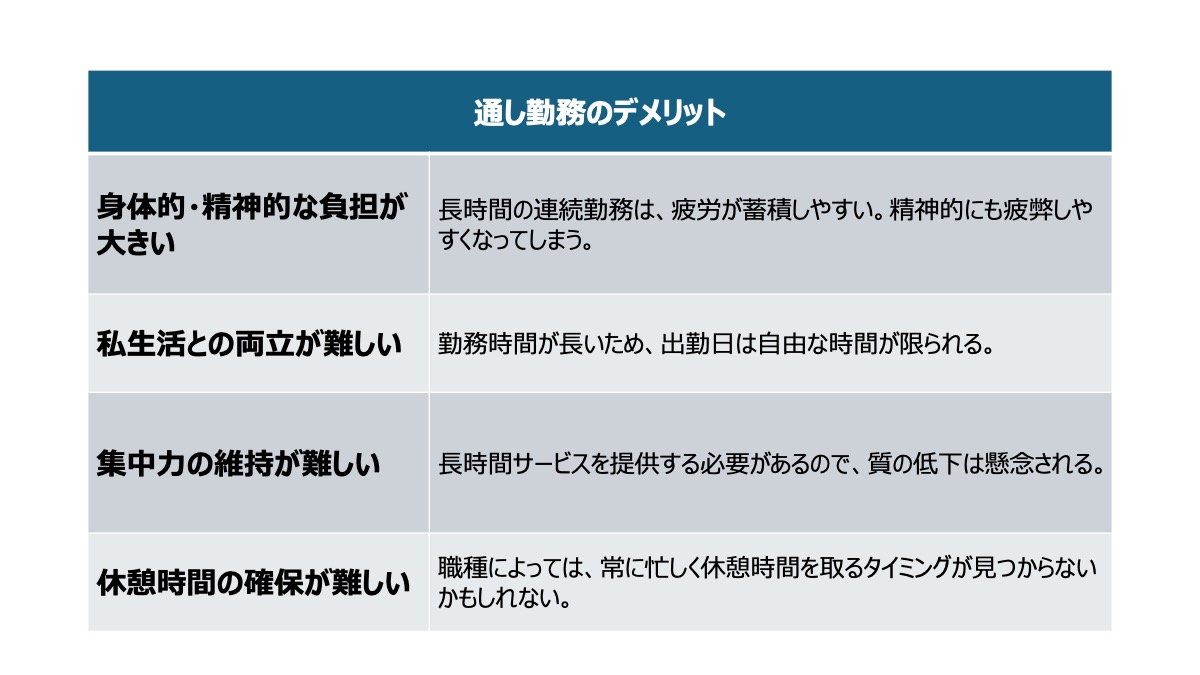 勤務時間が長いため、出勤日は自由な時間が限られます。出勤日もオンオフをはっきりさせて、自分の時間をたっぷり確保したい方には向いていないかもしれません。休日のまとまった時間でリフレッシュできる方は、問題なく働くことができるでしょう。