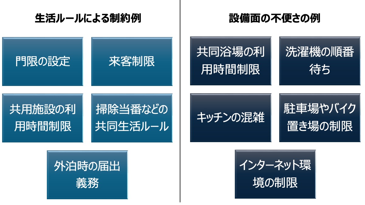 また、共用スペースの使用ルールや、門限の存在なども、自由な生活を制限する要因となることがあります。