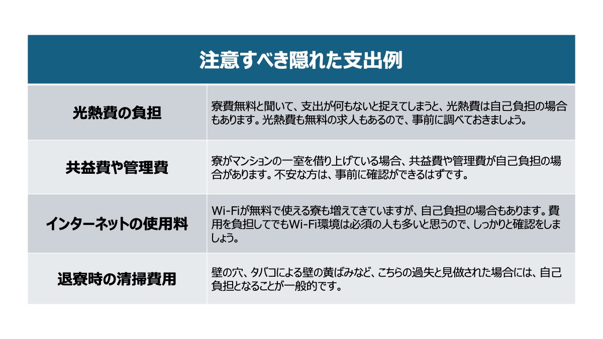 ただし、「寮費無料」と言っても、実際には様々な費用が発生する可能性があります。まず考えられるのが、光熱費の負担です。