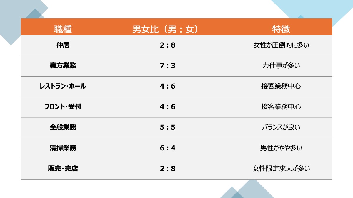 リゾート施設の中でも、特にホテルや旅館では職種によって男女比に特徴が見られます。レストランのホール業務やフロント業務は女性の割合が6割を超え、特に接客業務では女性スタッフの需要が高くなっています。一方、キッチンスタッフやベッドメイキング、施設管理などは男性スタッフの比率が高めです。