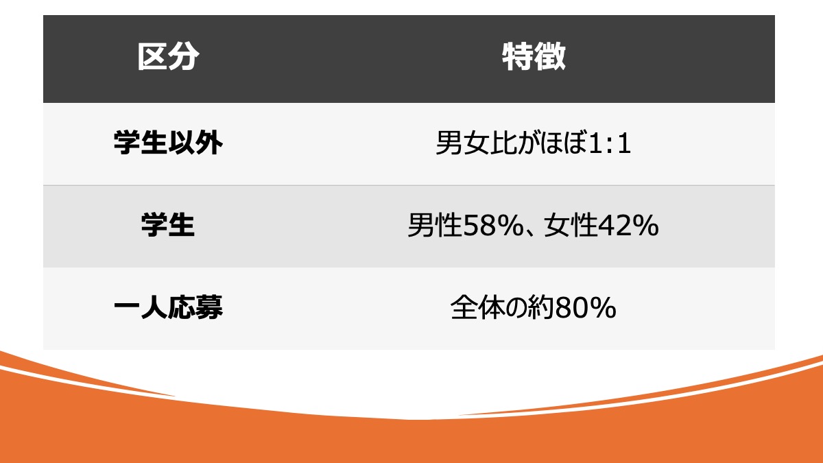 一方、社会人の場合は女性51%、男性49%と、わずかに女性の割合が高くなります。これは、リゾートバイトを通じたキャリアチェンジや、ワーケーション的な働き方を選択する女性が増加していることが要因として考えられます。